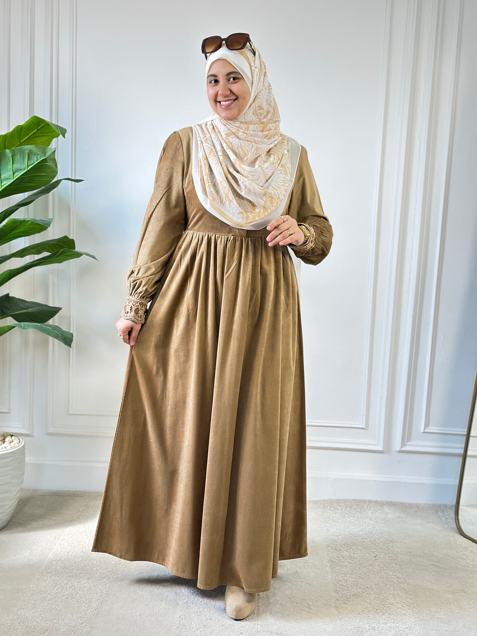 • الفستان جاي بـ زراير شيك جداً من قدام لحد الوسط، بتدي شكل كلاسيك