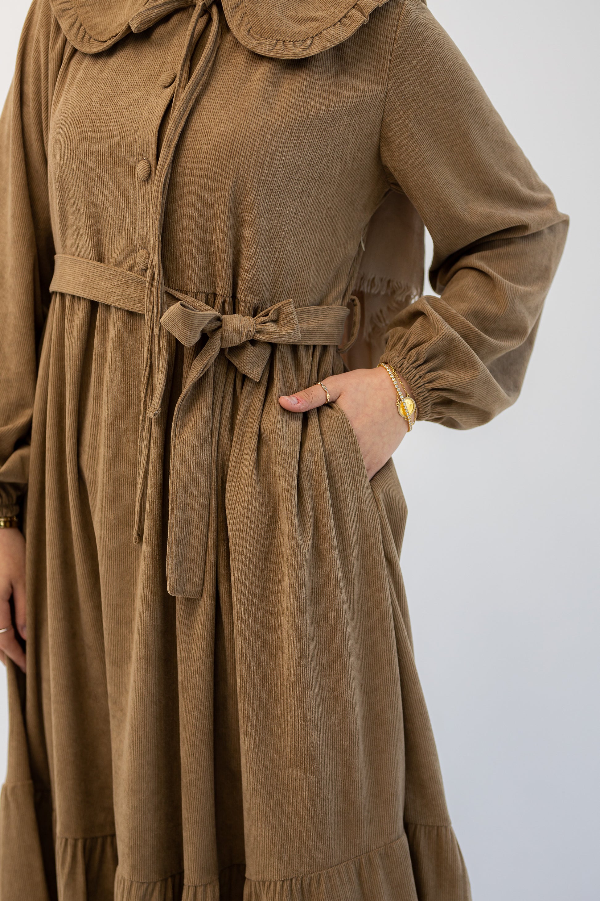 مصنوع من قماش شتوي تقيل بـ "ملمس بارز" (Textured)، بيضمن لك الدفا وفي نفس الوقت بيفضل مفرود وشكله "قيم" طول وقت اللبس.الياقة (الكول): بتصميم عريض ومدور بيدي لمسة كلاسيكية رقيقة.