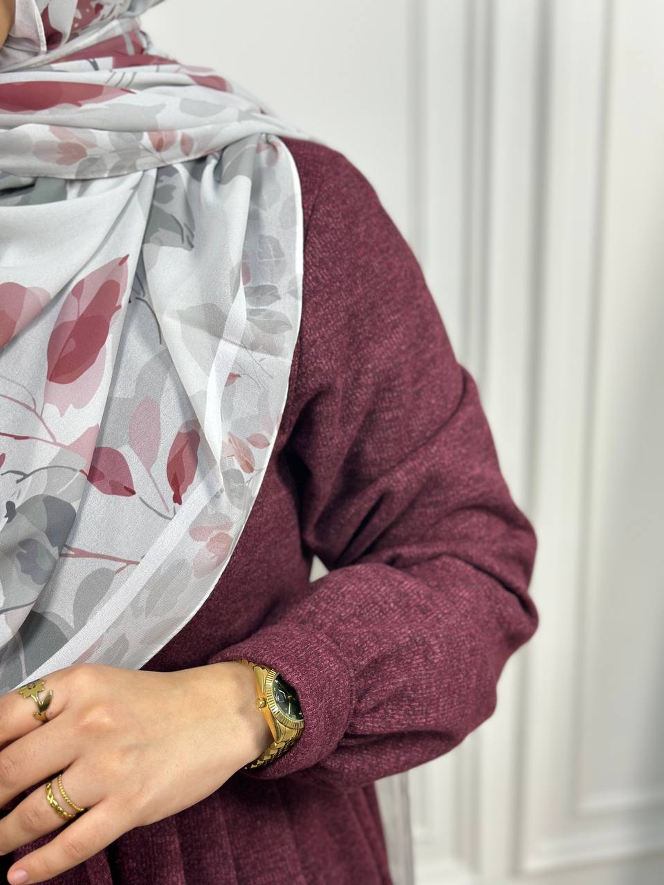يتميز الفستان بقصته الطويلة والمريحة (A-line) التي تضمن حرية الحركة، مع ياقة مدوّرة وأكتاف مزينة بتفاصيل أنيقة