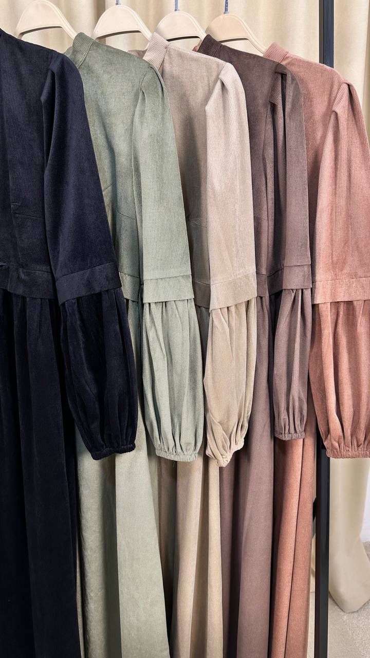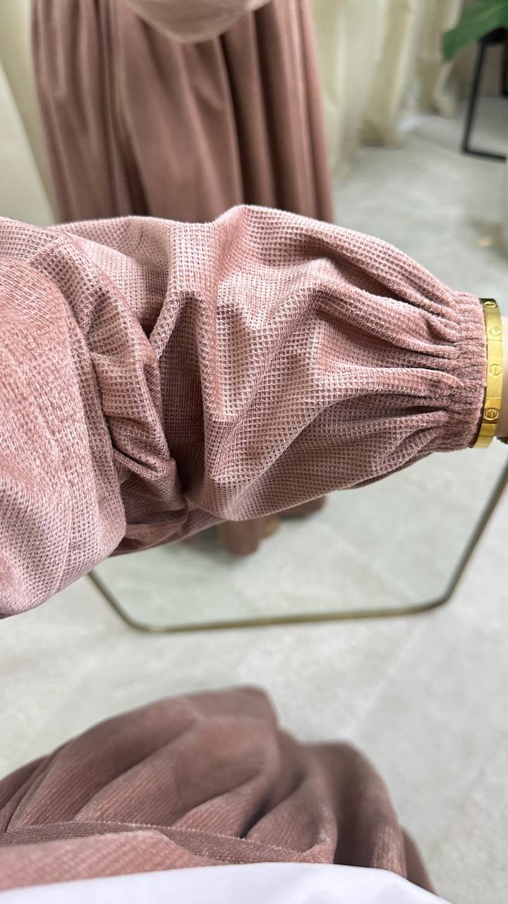 الخامة : خامة ناعمة بملمس مطفي (يشبه الشمواه أو الجيرسيه السميك)، بتدي شكل انسيابي ومحتشم.