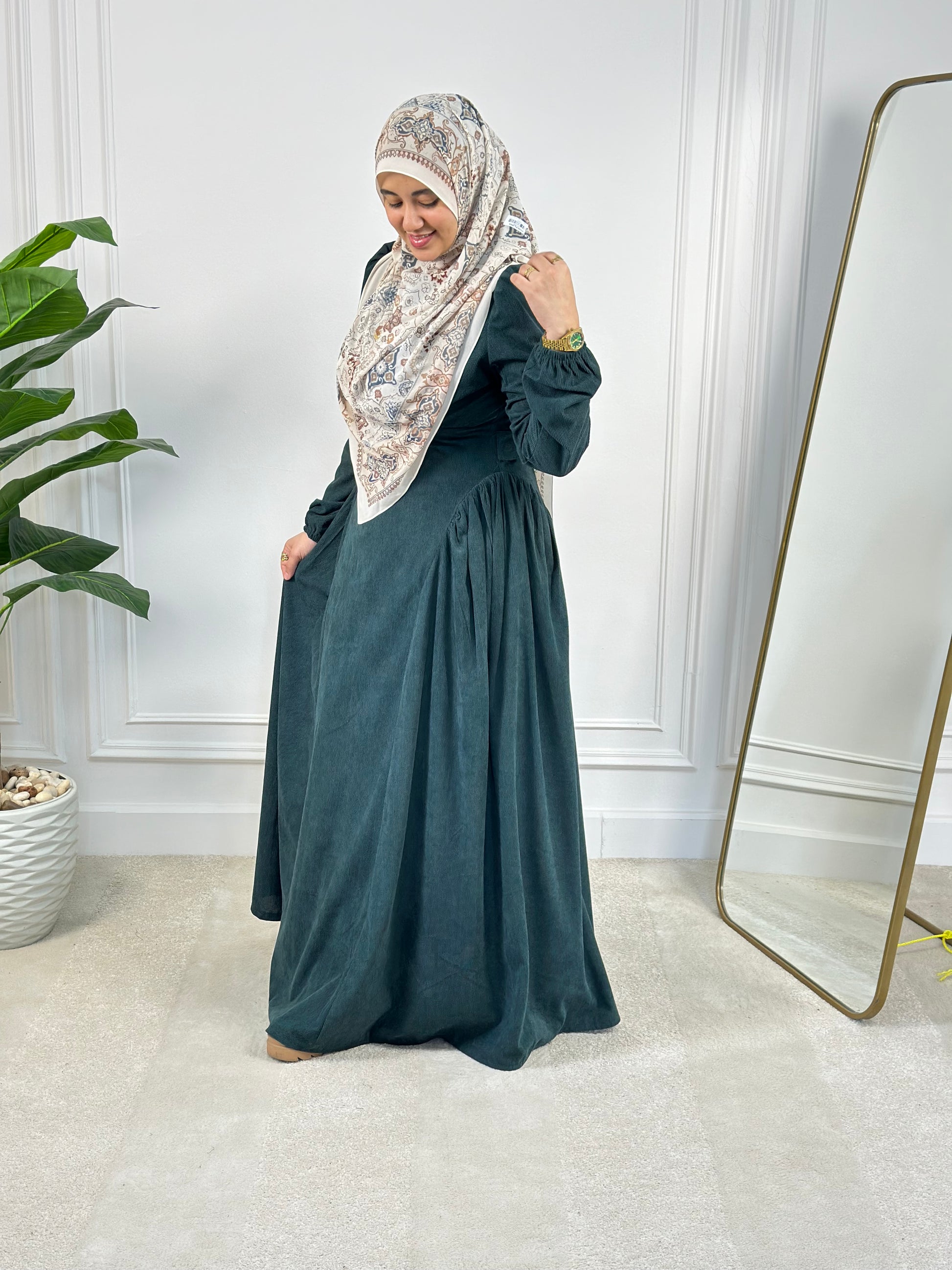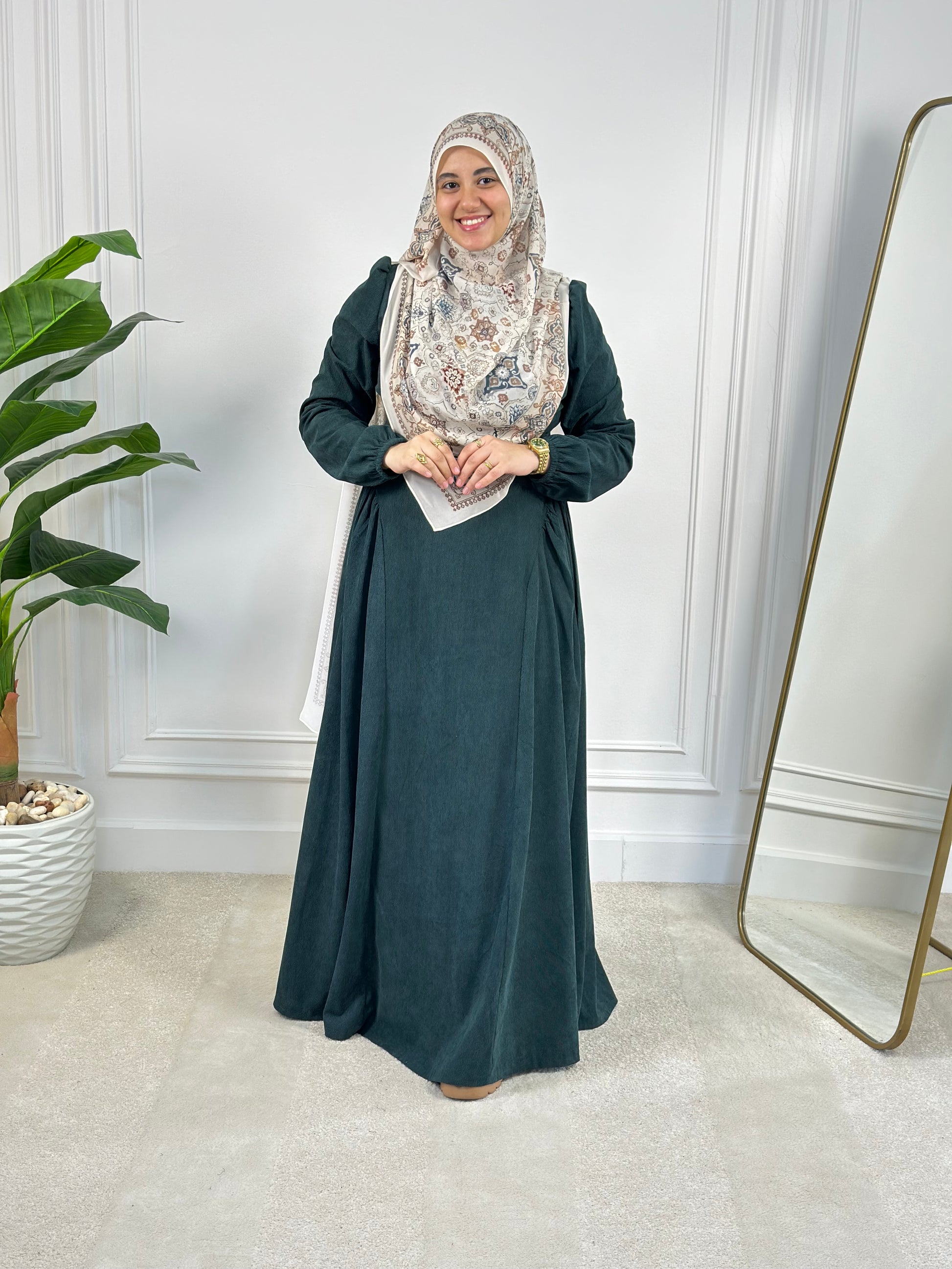 الموديل: فستان شتوي أنيق بطول ماكسي (Maxi Dress)، مصنوع من قماش القطيفة المضلعة، ويتميز بقصة كلاسيكية قماش شتوي دافئ وناعم الملمس